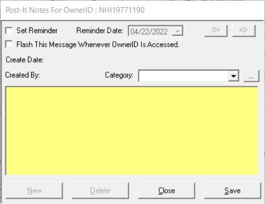 For example, you might use the Flash option to add an Owner Post-It to remind you that the customer must pay in cash due to several returned checks. In the future, any time this owner is selected by any user, the Post-It will automatically be displayed. You can add multiple Post-Its to a single record by pressing the New button.