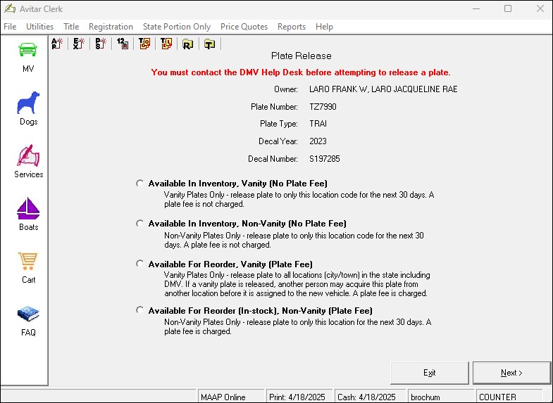 Once you’ve answered Yes to one of the above selections, search and select the vehicle (see Registration Lookup). This will bring you to the Plate Release screen. Remember, before you can process a Plate Release, you must contact DMV for their permission, if you are not on their Plate Release program list.
